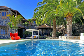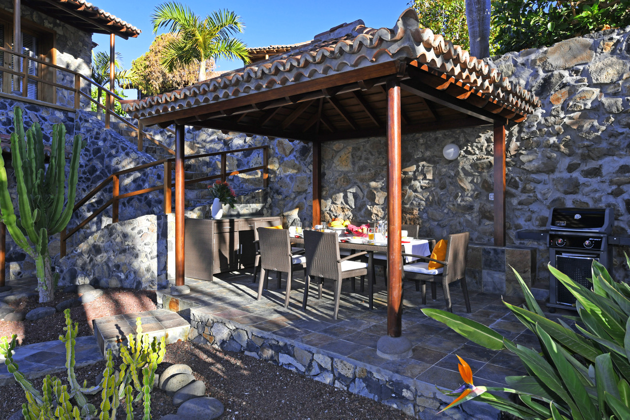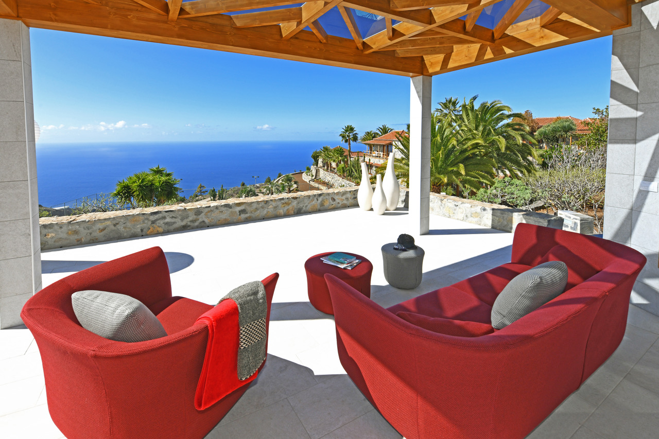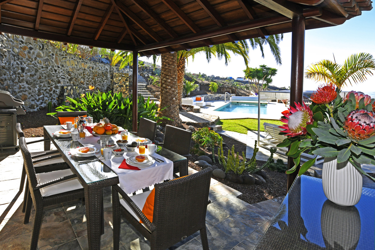 Der Pool bildet das Zentrum des großzügigen Spa-Bereichs, um den sich verschiedenen Sitz- und Sonnenplätze mit herrlichem Meerblick gruppieren: Sonnenliegen mit Panoramameerblick, eine Sonnenliegen mit Baldachin, ein Sitzbereich zum chillen am Pool, ein Essbereich im Pavillon mit Grillplatz und für die Siesta im Halbschatten stehen Liegen unter den großen Palmen bereit.